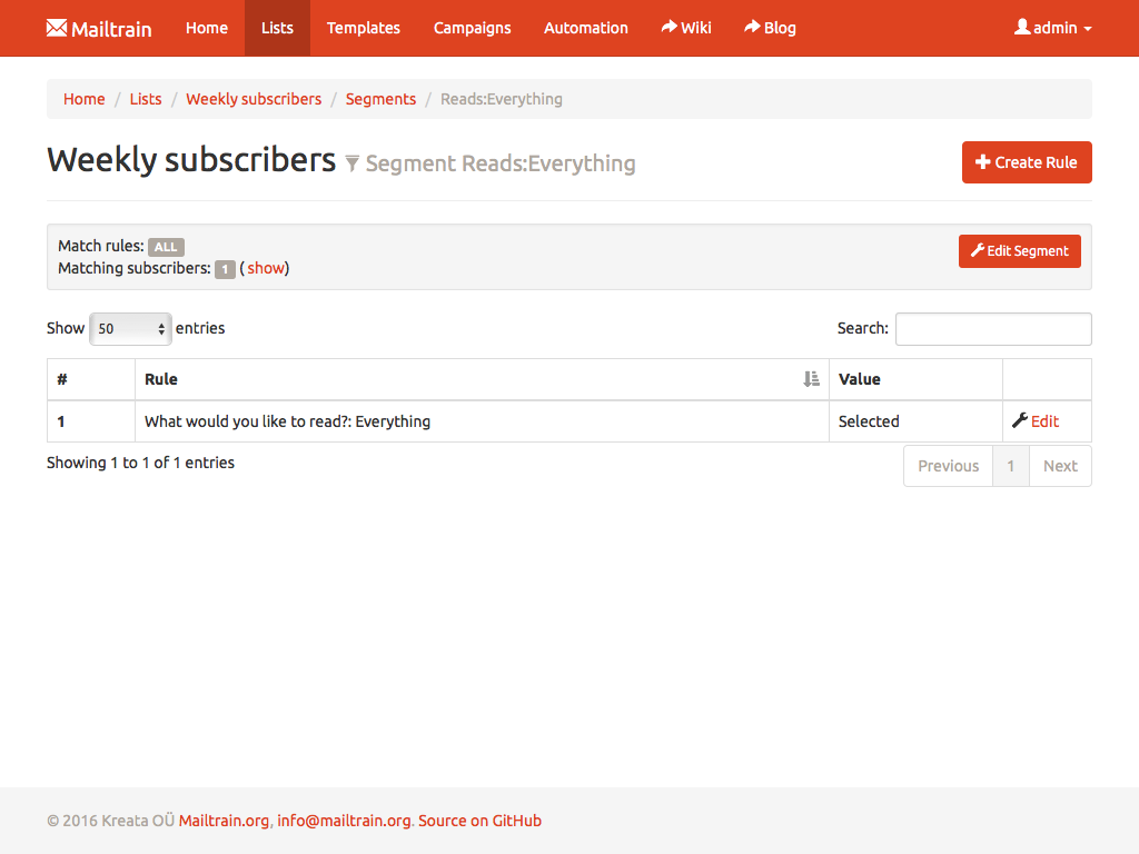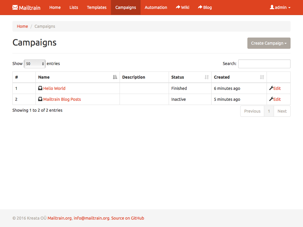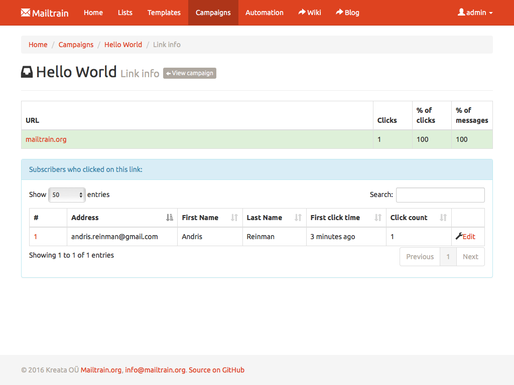 Setup Mailtrain to track RSS feeds and if a new entry is detected in a feed then Mailtrain auto-generates a new campaign using entry data as message contents and sends it to selected subscribers.