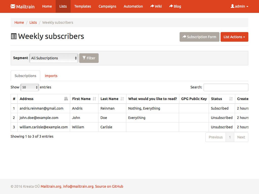 Text fields, numbers, drop downs or checkboxes, Mailtrain has them all. Every custom field can be included in the generated newsletters through merge tags. Mailtrain also supports custom forms.